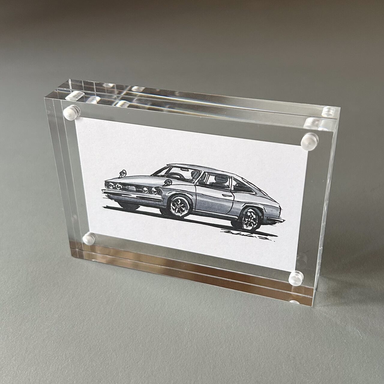 このカースケッチは、名刺サイズの紙にマーカーで描かれた原画です。