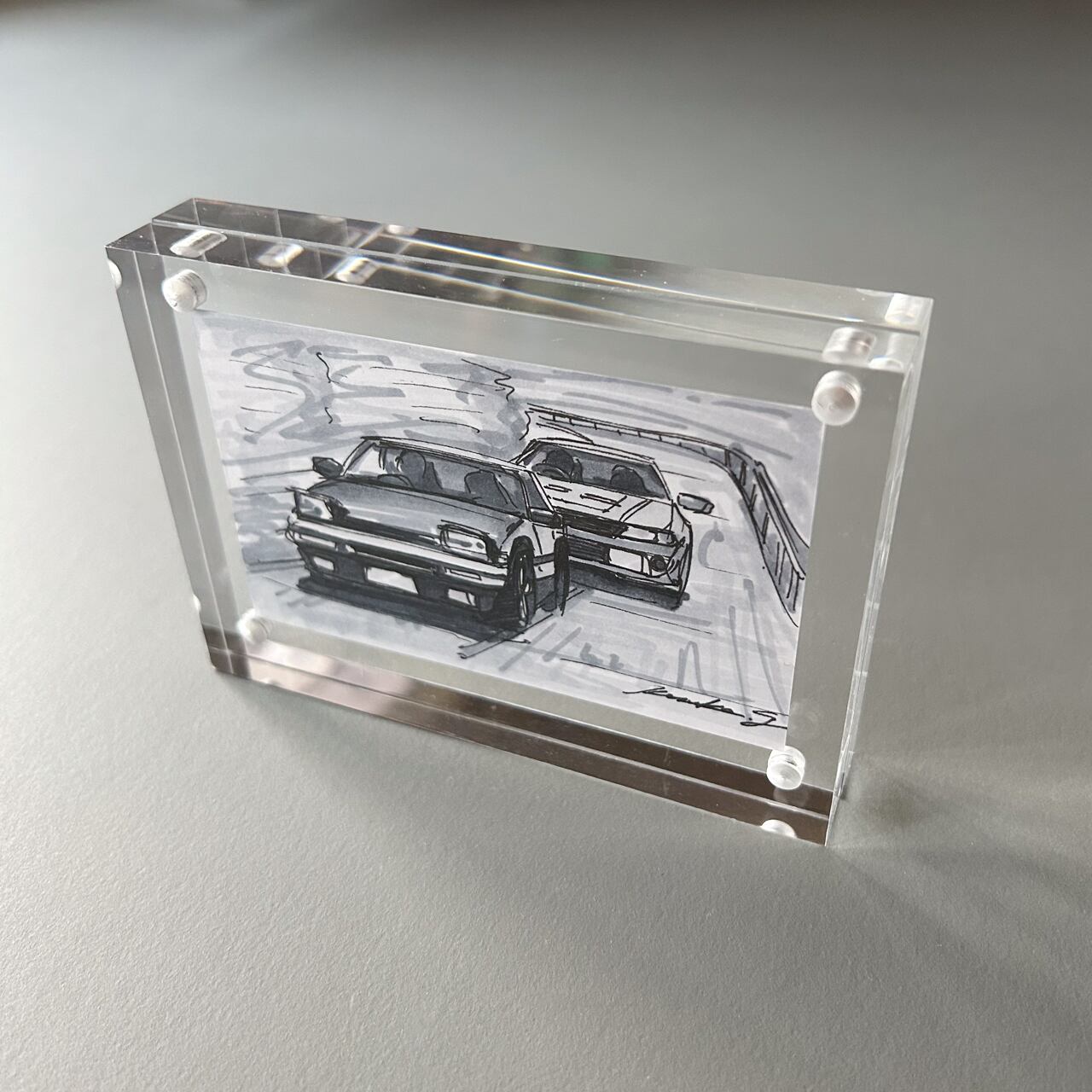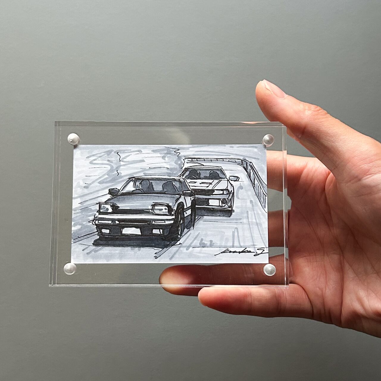 このカースケッチは、名刺サイズの紙にマーカーで描かれた原画です。